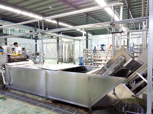 原料收集-清洗-拣果--预热灭酶-双道打浆-丝瓜视频污版-灌装-成品。包含原料预处理系统、预热灭酶系统、打浆系统,调配系统,均质脱气系统,丝瓜视频污版灌装系统。